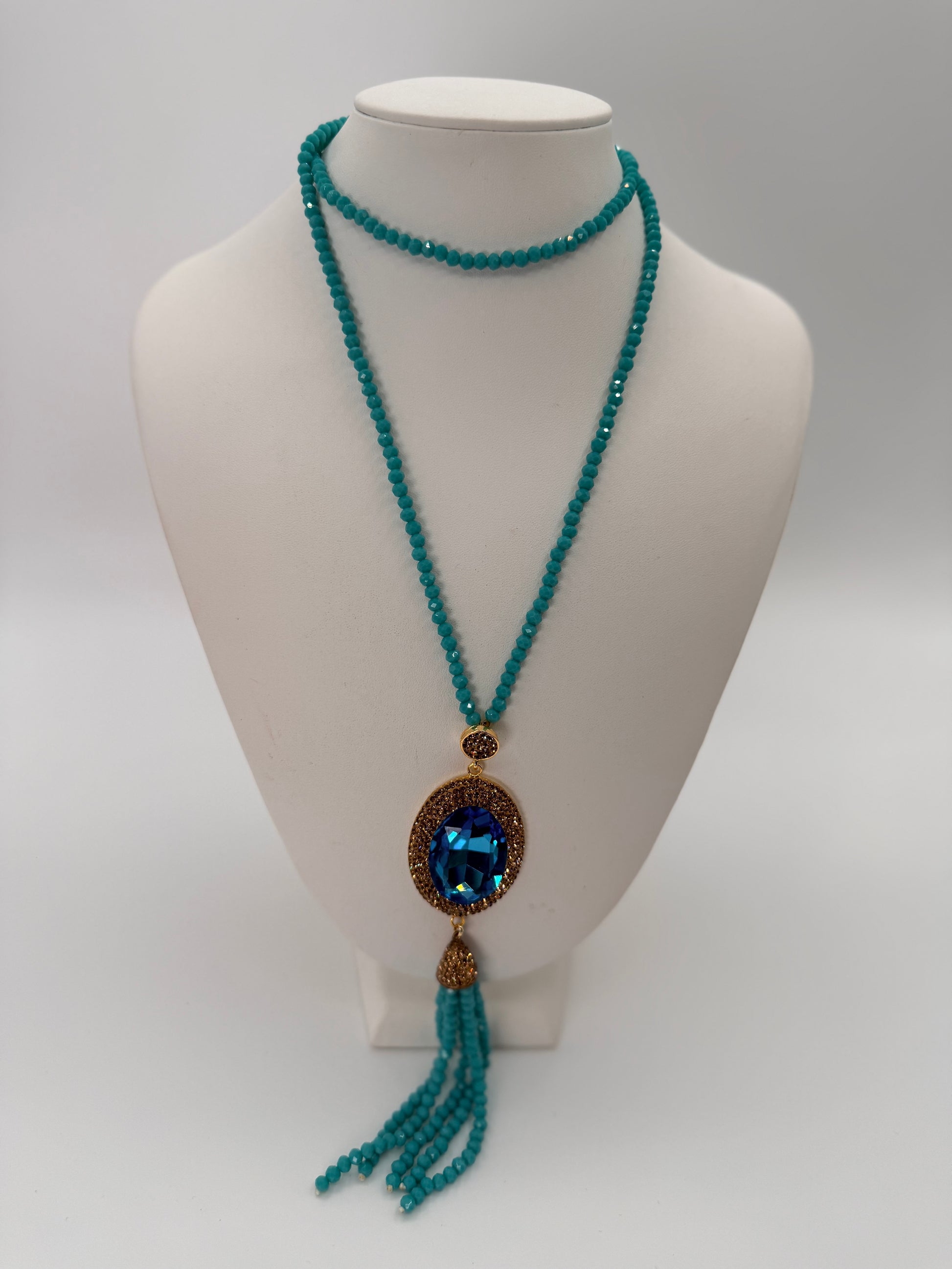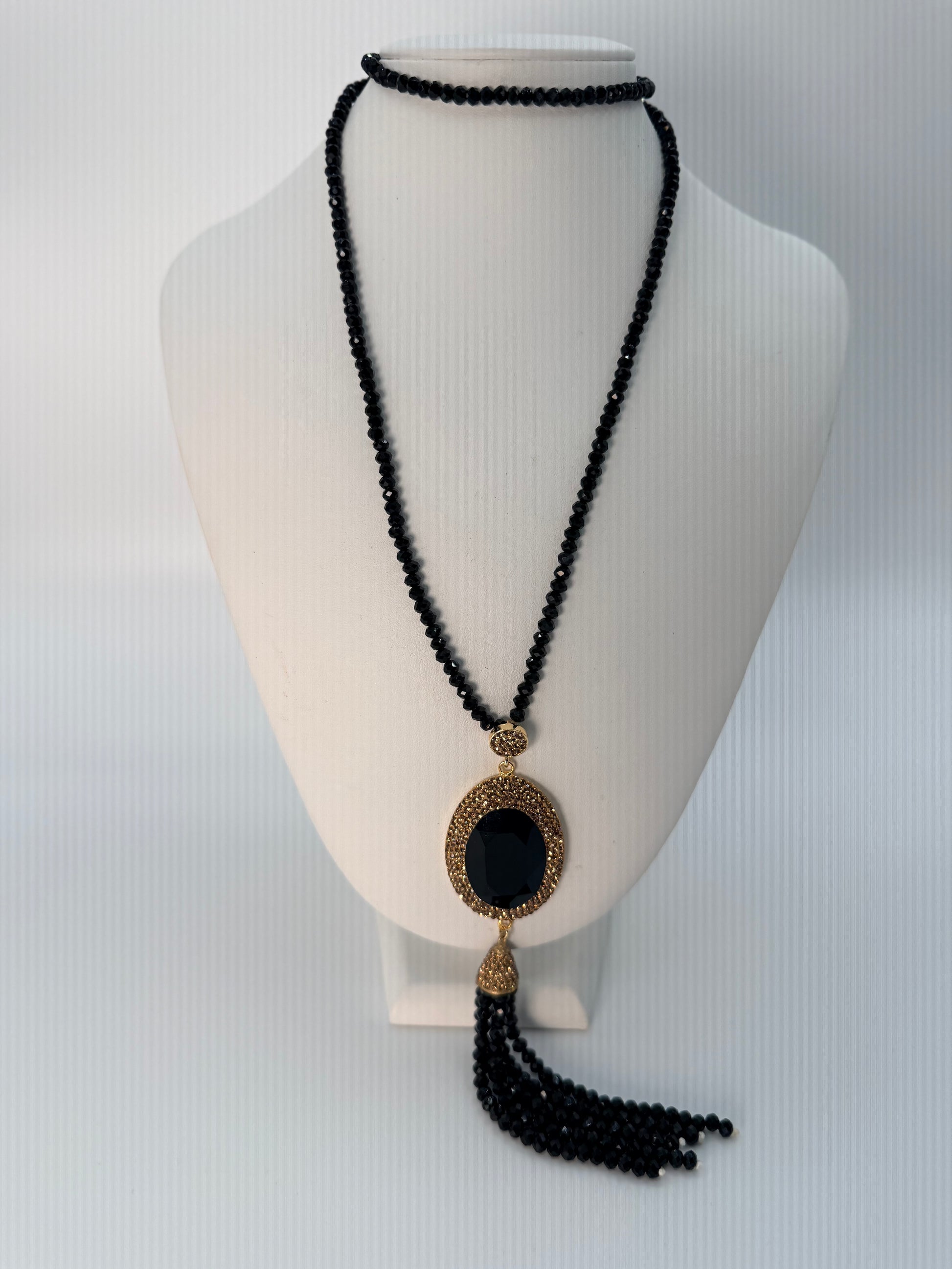 Elegant long necklace featuring a stunning oval crystal centerpiece framed with gold marcasite detailing. Delicate beaded chain with decorative tassel accent.