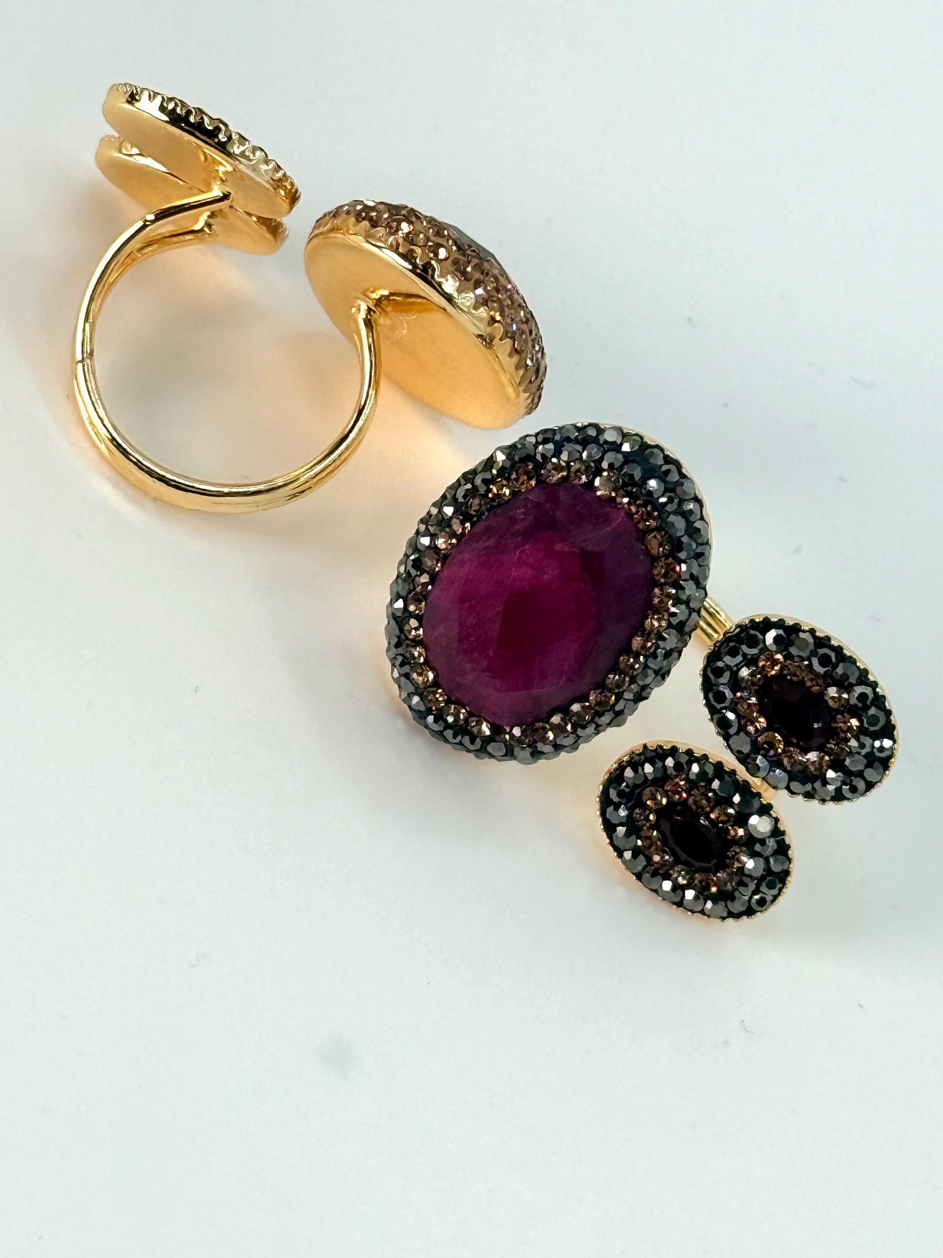 Stunning handcrafted ring featuring three faceted gemstones in a unique curved design. Each stone is surrounded by sparkling black marcasites set in luxurious settings.: